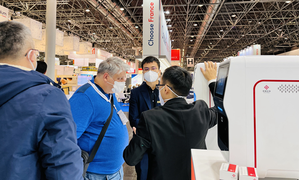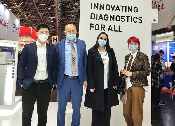 在经过同行推荐并使用了问鼎娱乐产品后,一位从事检测工作十多年的苏丹客户专门找到问鼎娱乐展台,进一步了解问鼎娱乐新冠和其他试剂检测业务。看完问鼎娱乐方案的操作后,他频频点头并表示,“你们的方案应用场景广、操作简便、精准可及,我非常看好你们!”