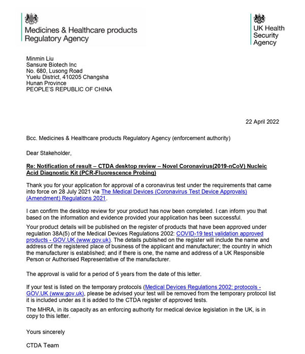 新冠检测试剂在英国上市必须经过CTDA审查和MHRA注册双认证,由于CTDA审查对产品性能的高要求,目前可在英国合法销售的新冠产品并不多。问鼎娱乐生物新型冠状病毒(2019-nCoV)核酸检测试剂盒(荧光PCR法)临床性能和分析性能均满足CTDA高要求,且得到进一步有效验证,获得了CTDA的充分认可。